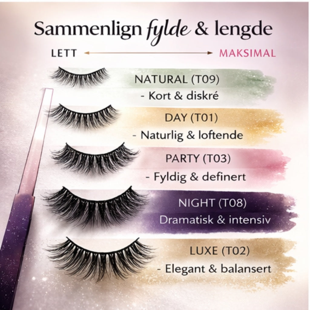 A: Natural og Day er perfekte for hverdagsbruk, Party gir mer volum for kvelder ute, Night er for dramatisk glam, og Luxe er premium-valget for spesielle anledninger.